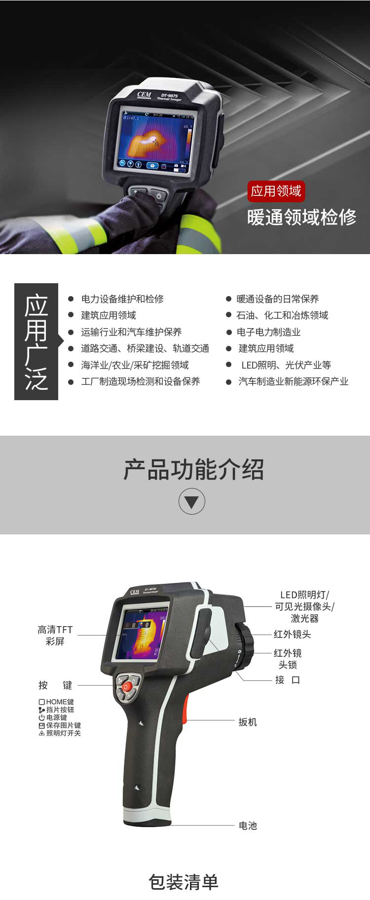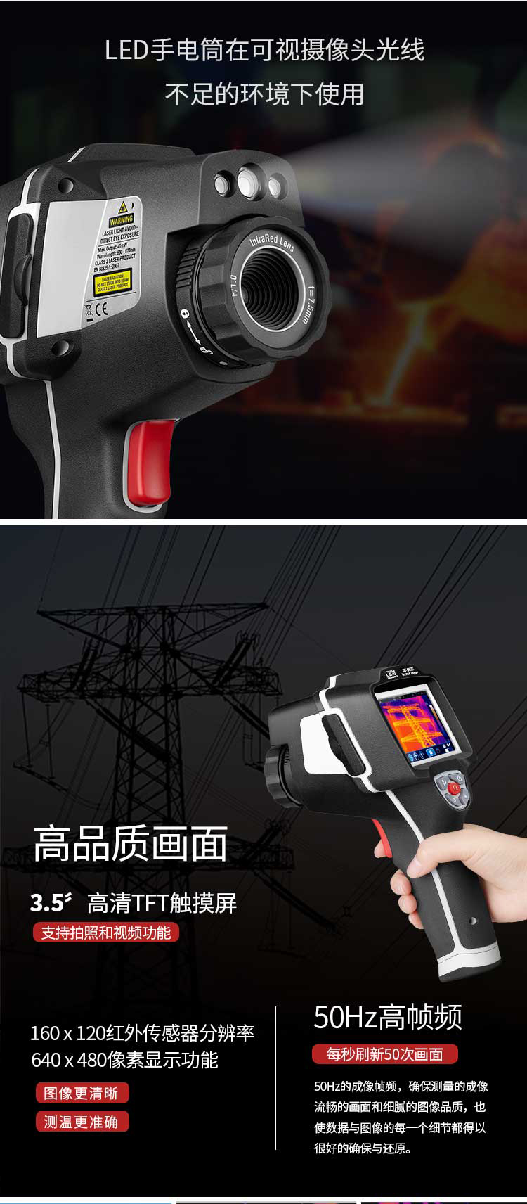 標(biāo)配鏡頭7.5mm,分辨率160×120,IFOV:3.33mard,視場角29.8×22.6°,熱靈敏度NETD<0.08℃,圖像幀頻50Hz,溫度范圍(-20-150、0-400),可見光分辨率640×480像素