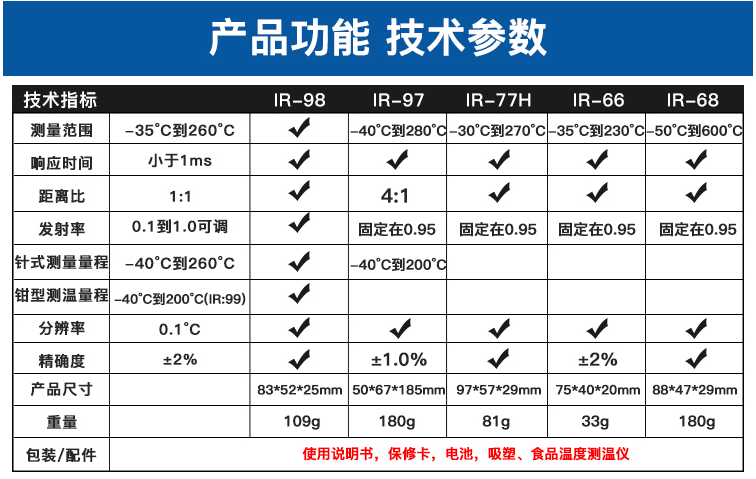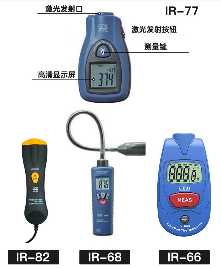 IR-66掌上式紅外測(cè)溫儀包括IR-66、IR-66B兩個(gè)型號(hào)。 CEM出品的IR-66系列掌上式紅外線測(cè)溫儀,符合人體工程學(xué)設(shè)計(jì),其體積比手掌還小,方便攜帶,是您工作上各種設(shè)備檢修、溫度情況了解,以及您日常生活起居的多功能測(cè)溫儀佳選擇。 IR-66掌上式紅外線測(cè)溫儀特性: 1.*的非接觸式測(cè)量 2.獨(dú)特新穎的外觀設(shè)計(jì) 3.自動(dòng)關(guān)機(jī)及自動(dòng)記錄數(shù)據(jù) 4.℃/℉ 轉(zhuǎn)換裝置 5.自動(dòng)量程選擇及大小值記錄 6.小巧的尺寸設(shè)計(jì)使測(cè)量方便又便于攜帶 7.大的液晶顯示屏 8.上鎖功能及低電量提示