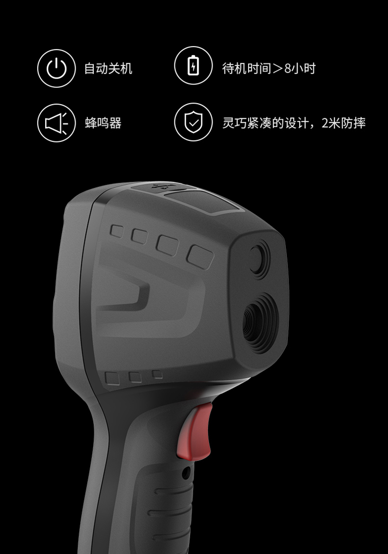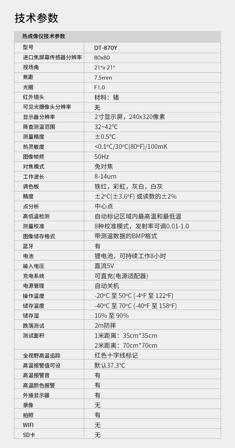 分辨率:80*80、圖像幀頻:50HZ、篩查測溫范圍:32-42℃、藍(lán)牙連接手機(jī)軟件