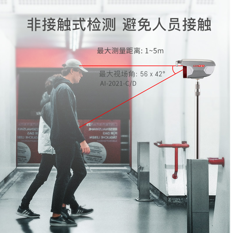 2安裝與維護(hù) 2-1,紅外熱像告警系統(tǒng)部署原則 AI-2021紅外熱像告警系統(tǒng)屬于精密測(cè)溫和成像設(shè)備,對(duì)部署應(yīng)用有一定要求,注意事項(xiàng)如下: ·安裝環(huán)境:設(shè)備機(jī)頭所處位置需光線良好(照明度≥10OLux),應(yīng)避免處于逆光的位置;設(shè)備機(jī)頭布置位置附近3米范圍內(nèi)不應(yīng)有空調(diào)出風(fēng)口;設(shè)備機(jī)頭所監(jiān)控的視場(chǎng)內(nèi),不能受到光照、西曬等外界強(qiáng)熱源的干擾; ·機(jī)頭布置:合理布置AI-2021機(jī)頭的位置,向下俯視角度為13°~15°;合理布局人員檢測(cè)位置和范圍,Al-2021機(jī)頭的攝像頭距離被測(cè)人員的額頭的位置為1.0~5.0米,最佳測(cè)試位置為2.0米; ·被測(cè)人員要求:戶外陽光照射后,或者劇烈運(yùn)動(dòng)后,需在室內(nèi)環(huán)境平靜適應(yīng)5分鐘后進(jìn)行測(cè)試;人員從戶外場(chǎng)景進(jìn)入室內(nèi),建議經(jīng)過回廊緩沖至少10秒鐘后,再步入檢測(cè)位置,如果室內(nèi)外溫差較大時(shí),建議在室內(nèi)停留2~3min再行檢測(cè);確保待測(cè)人員整個(gè)面部處于設(shè)備攝像視野內(nèi),同時(shí)面部及額頭不能被遮擋(帽子、圍巾、墨鏡、面具、退燒貼等可能遮擋面部的物件,建議先提前摘下,適應(yīng)0.5-1分鐘后再進(jìn)行測(cè)試。)