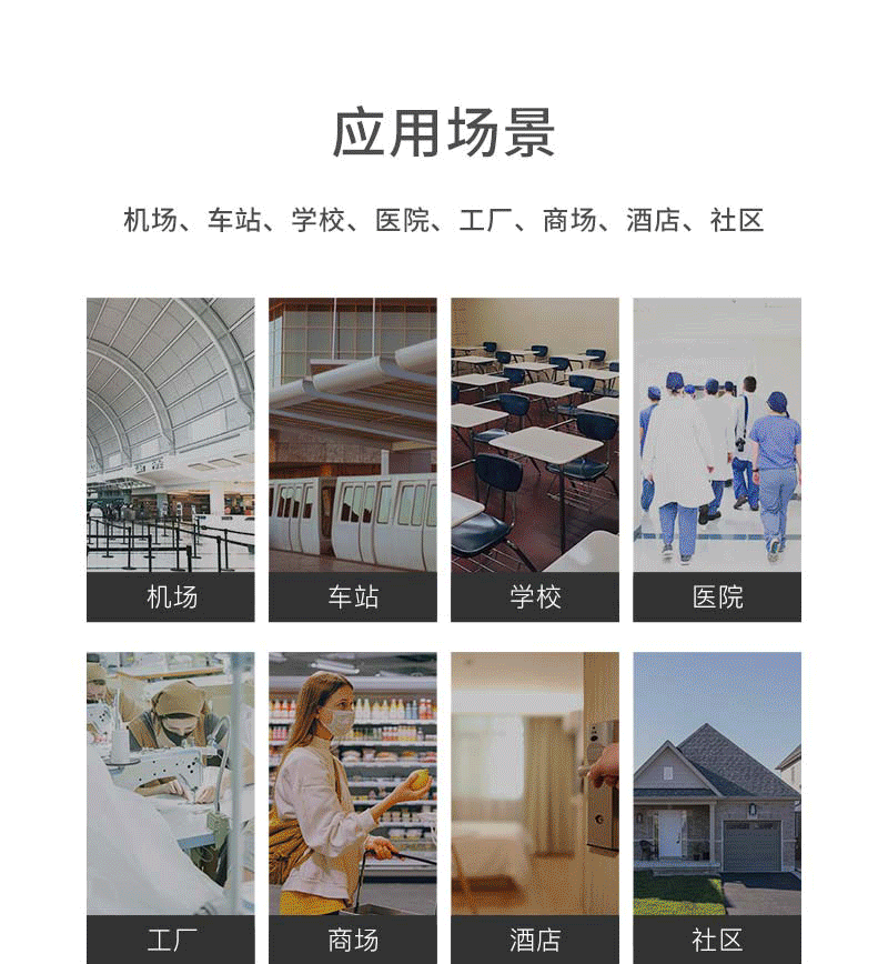 注意事項(xiàng) 紅外熱像告警系統(tǒng)應(yīng)正確安裝,可自動(dòng)跟蹤人體額頭區(qū)域并顯示體溫,操作人員應(yīng)經(jīng)生產(chǎn)廠家專業(yè)培訓(xùn),并嚴(yán)格按說明書使用。 ·應(yīng)嚴(yán)格按照中國國標(biāo)(GB_T19146-2010)和各地市場(chǎng)監(jiān)管局的要求創(chuàng)造使用條件;·嚴(yán)格按照規(guī)范要求,安裝在室內(nèi)無風(fēng)或者微風(fēng)的固定位置使用,室溫環(huán)境在16°℃~32°C,避免陽光、風(fēng)和其他熱源干擾(環(huán)境溫度超出16°℃~32°℃,需要安裝空調(diào),并在產(chǎn)品3m內(nèi)無風(fēng)或者微風(fēng)); ·若安裝在室外,必須搭建棚子或者板房來保證環(huán)境穩(wěn)定; ·戶外陽光照射后、劇烈運(yùn)動(dòng)后或從溫差較大的戶外場(chǎng)景進(jìn)入室內(nèi),需在室內(nèi)環(huán)境平靜靜置5分鐘后進(jìn)行測(cè)試。