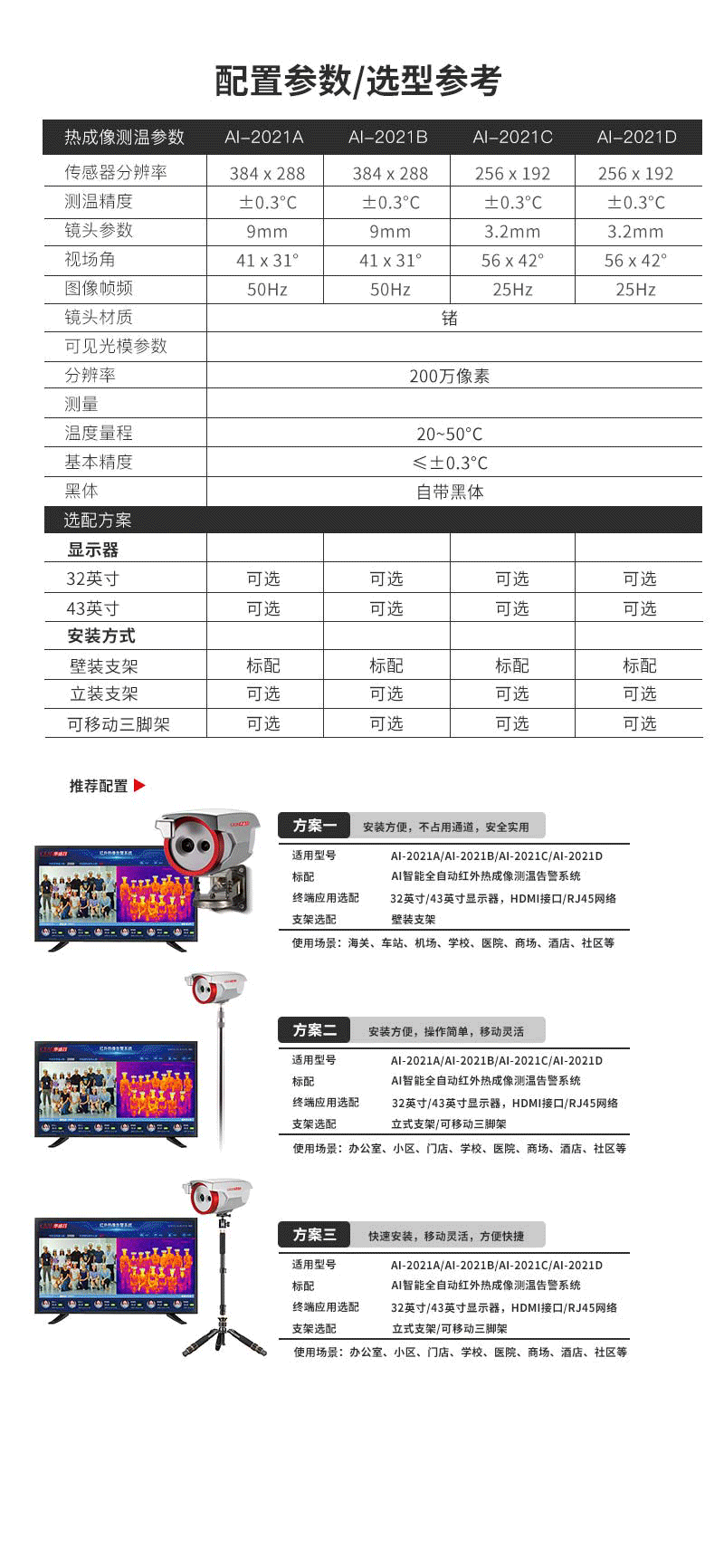 2安裝與維護(hù) 2-1,紅外熱像告警系統(tǒng)部署原則 Al-2021紅外熱像告警系統(tǒng)屬于精密測(cè)溫和成像設(shè)備,對(duì)部署應(yīng)用有一定要求,注意事項(xiàng)如下: ·安裝環(huán)境:設(shè)備機(jī)頭所處位置需光線(xiàn)良好(照明度≥10OLux),應(yīng)避免處于逆光的位置;設(shè)備機(jī)頭布置位置附近3米范圍內(nèi)不應(yīng)有空調(diào)出風(fēng)口;設(shè)備機(jī)頭所監(jiān)控的視場(chǎng)內(nèi),不能受到光照、西曬等外界強(qiáng)熱源的干擾; ·機(jī)頭布置:合理布置A-2021機(jī)頭的位置,向下俯視角度為13°~15°;合理布局人員檢測(cè)位置和范圍,AI-2021機(jī)頭的攝像頭距離被測(cè)人員的額頭的位置為1.0~5.0米,最佳測(cè)試位置為2.0米;