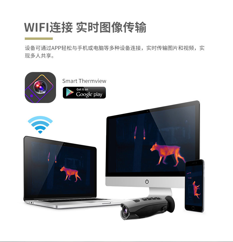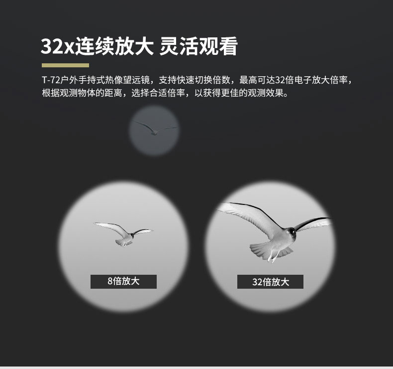 T-72系列熱成像儀望遠鏡 ●384*288進口傳感器 ●32倍連續(xù)放大靈活觀看 ●50Hz高圖像幀頻 ●WIFI連接實時圖像傳輸 ●可選外接大屏