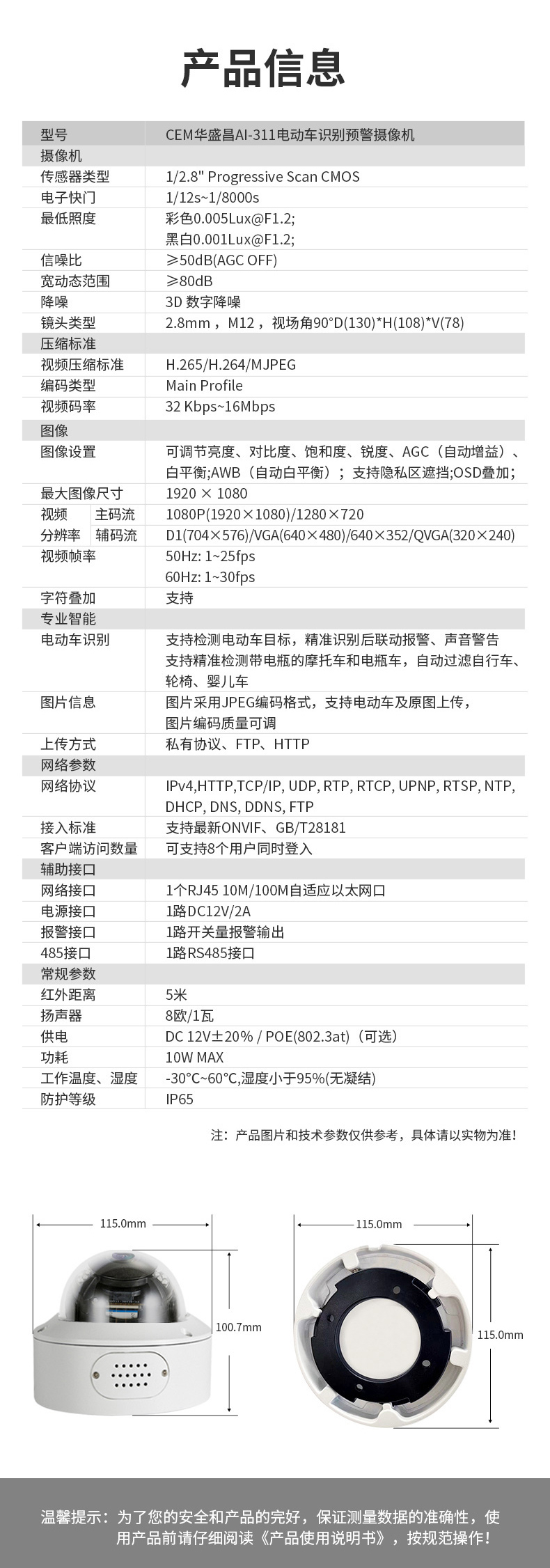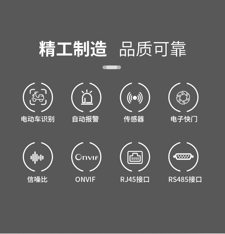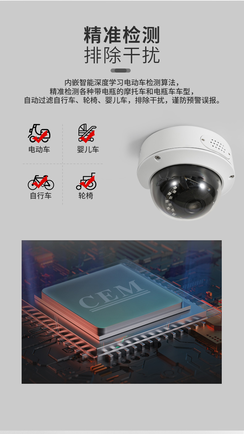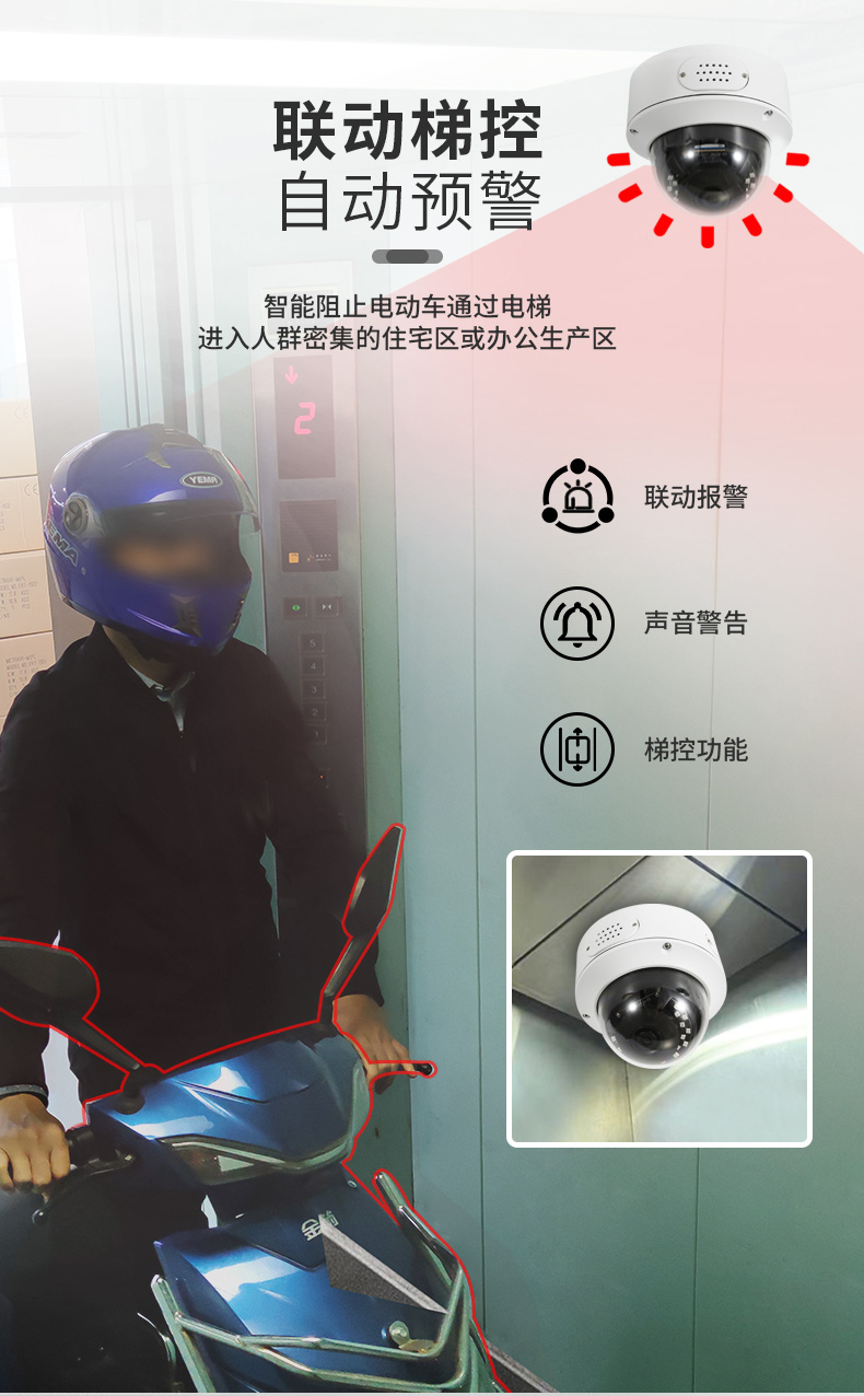 電動(dòng)車識(shí)別預(yù)警攝像機(jī):電動(dòng)車識(shí)別預(yù)警攝像機(jī)設(shè)備嵌入電動(dòng)車識(shí)別算法,實(shí)現(xiàn)對(duì)電動(dòng)車檢測(cè)分析識(shí)別,實(shí)時(shí)預(yù)警周界區(qū)域內(nèi)電動(dòng)車闖入事件,前端攝像機(jī)一體化完成分析、識(shí)別、預(yù)警,并上傳平臺(tái)。