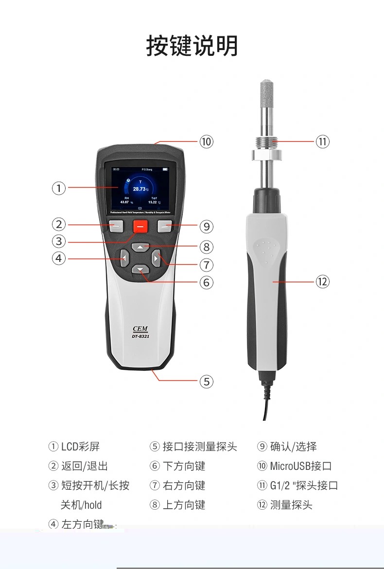 產(chǎn)品概述 CEM DT-8321是CEM華盛昌新設計、研發(fā)和制造的一款高精度專業(yè)手持式露點儀,精度高范圍廣,能在較寬的測量范圍內(nèi)準確測量露點溫度,探頭可直接插入加壓過程中,并快速響應測試過程環(huán)境條件,為工業(yè)露點測量應用提供準確快速的測量。產(chǎn)品廣泛應用于實驗室、電力電氣、SF6氣體測量、精密制造、化工制藥等領域的大溫度、大壓力范圍內(nèi)的直接過程露點測量。 產(chǎn)品優(yōu)勢 性能穩(wěn)定,維修成本低,可專業(yè)用于工業(yè)現(xiàn)場檢測和戶外校驗等場合。 高品質(zhì)傳感器,測量更準確,適用于低露點測量。測量范圍達-50至+30°C,低濕度測量<5%RH。●傳感器可承受凝結(jié),無需擔心結(jié)露影響測量精度。 傳感器探頭具備凈化功能以及加熱功能,預熱時間短,測量結(jié)果更穩(wěn)定。 靈活的數(shù)據(jù)記錄功能,可設置自動記錄間隔,CSV文件可以通過USB傳輸?shù)絇C端。 測量數(shù)據(jù)可一鍵保存,可使用電腦中的Excel軟件查看。 外形堅固,緊湊,小巧,外加藍色彩屏設計,界面更加直觀簡潔。 可充電設計,持久續(xù)航更方便。