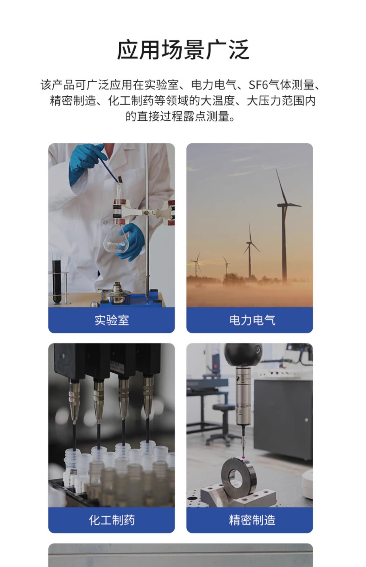 產(chǎn)品應用 手持式露點儀是一種便捷、準確、可靠的空氣濕度測量設備,其在實驗室、工業(yè)生產(chǎn)、環(huán)境監(jiān)測等領域中具有廣泛的應用前景。 實驗室 在化學、生物、醫(yī)學等實驗室中常常需要測量空氣中的相對濕度和露點溫度以掌握實驗條件。 工業(yè)生產(chǎn) 在制造、加工、儲存等工業(yè)領域中,可用于監(jiān)測空氣中的水分含量,保障生產(chǎn)過程的穩(wěn)定性和質(zhì)量。 環(huán)境監(jiān)測 在氣象、環(huán)保、建筑等領域中,可用于監(jiān)測大氣中的相對濕度、露點溫度等指標,以便更好地了解環(huán)境狀態(tài)。 工業(yè)應用 諸如空氣干燥設備、塑料注塑設備、手套箱干燥設備、鋰電池水分檢測、氫氣、二氧化碳、水份檢測等。
