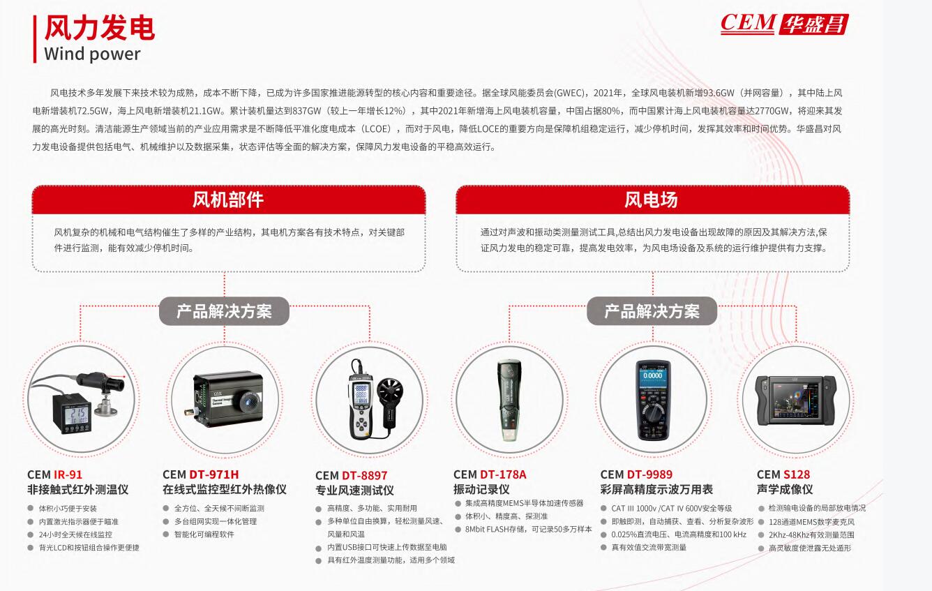 電新增接機7.6W,海上風(fēng)電斯新增裝機211G6W。累計裝機量達(dá)到3375W(較上一年增長12%),其中201年新增海上風(fēng)電較機容量,中國占據(jù)80%,而中國累計海上風(fēng)電裝機容最達(dá)7OCSW,將迎來其發(fā)展的高光時刻。浦潔能源生產(chǎn)領(lǐng)域當(dāng)前的產(chǎn)業(yè)應(yīng)用需求是不斷降低平淮化度電成本(LCOE),而對于風(fēng)電,降低LOC的重要方向是保嘀機組穩(wěn)定運行,減少停機時間,發(fā)揮其效率和時間優(yōu)勢。華盛昌對風(fēng)力發(fā)電設(shè)備提供包括電氣、機械維護(hù)以及數(shù)據(jù)采集,狀態(tài)評估等全面的解決方案,保障風(fēng)力發(fā)電設(shè)備的平穩(wěn)高效運行。